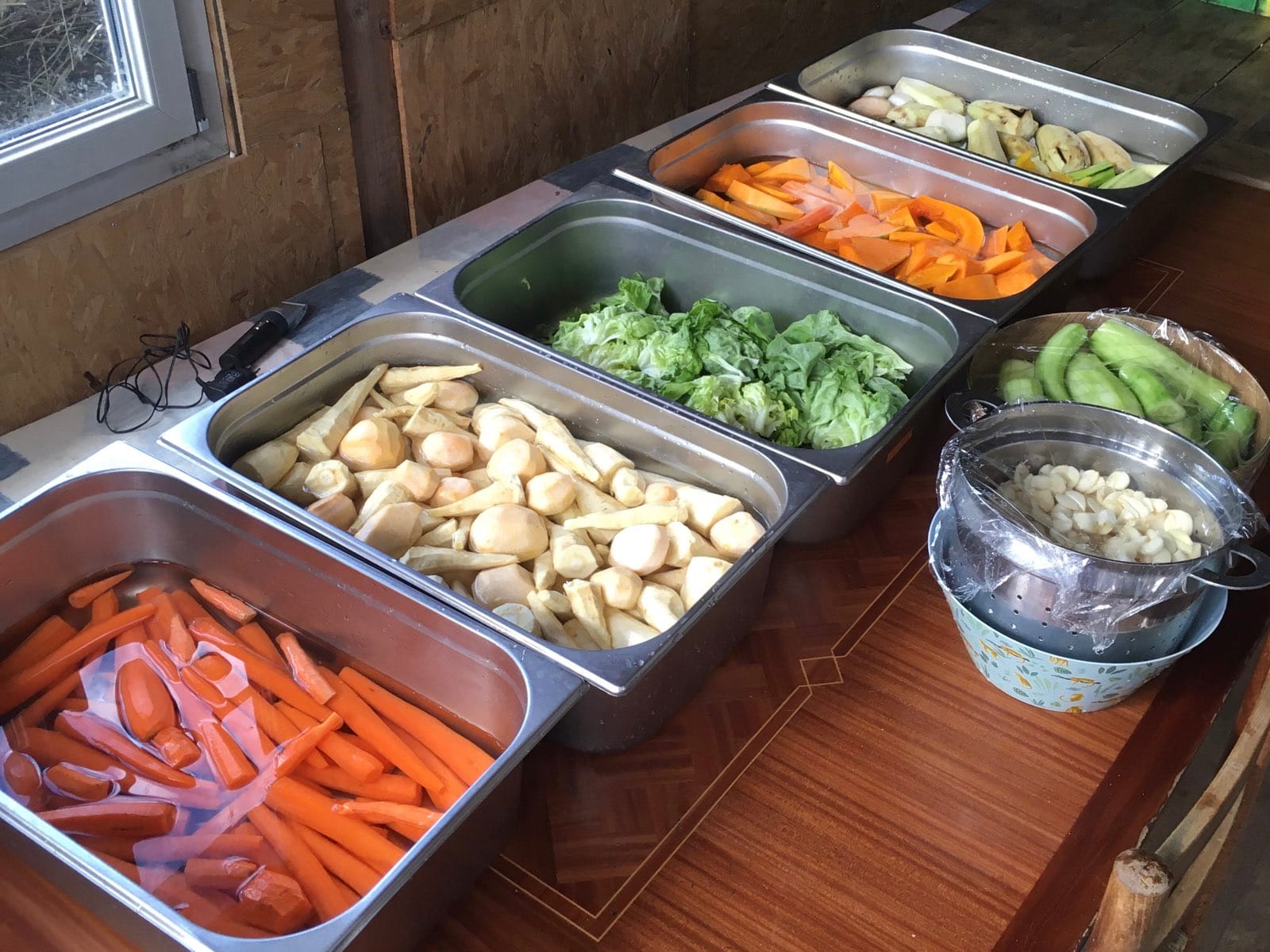 Après avoir mis en évidence les ingrédients à disposition, on réfléchit aux recettes qui pourraient être cuisinées et certaines personnes partent aux courses pour compléter. Il s’ensuit une après-midi et soirée de cuisine qui fait éclore progressivement de succulents plats. Cet atelier de cuisine collective se prolonge en musique et continue le lendemain matin pour finir les derniers préparatifs.