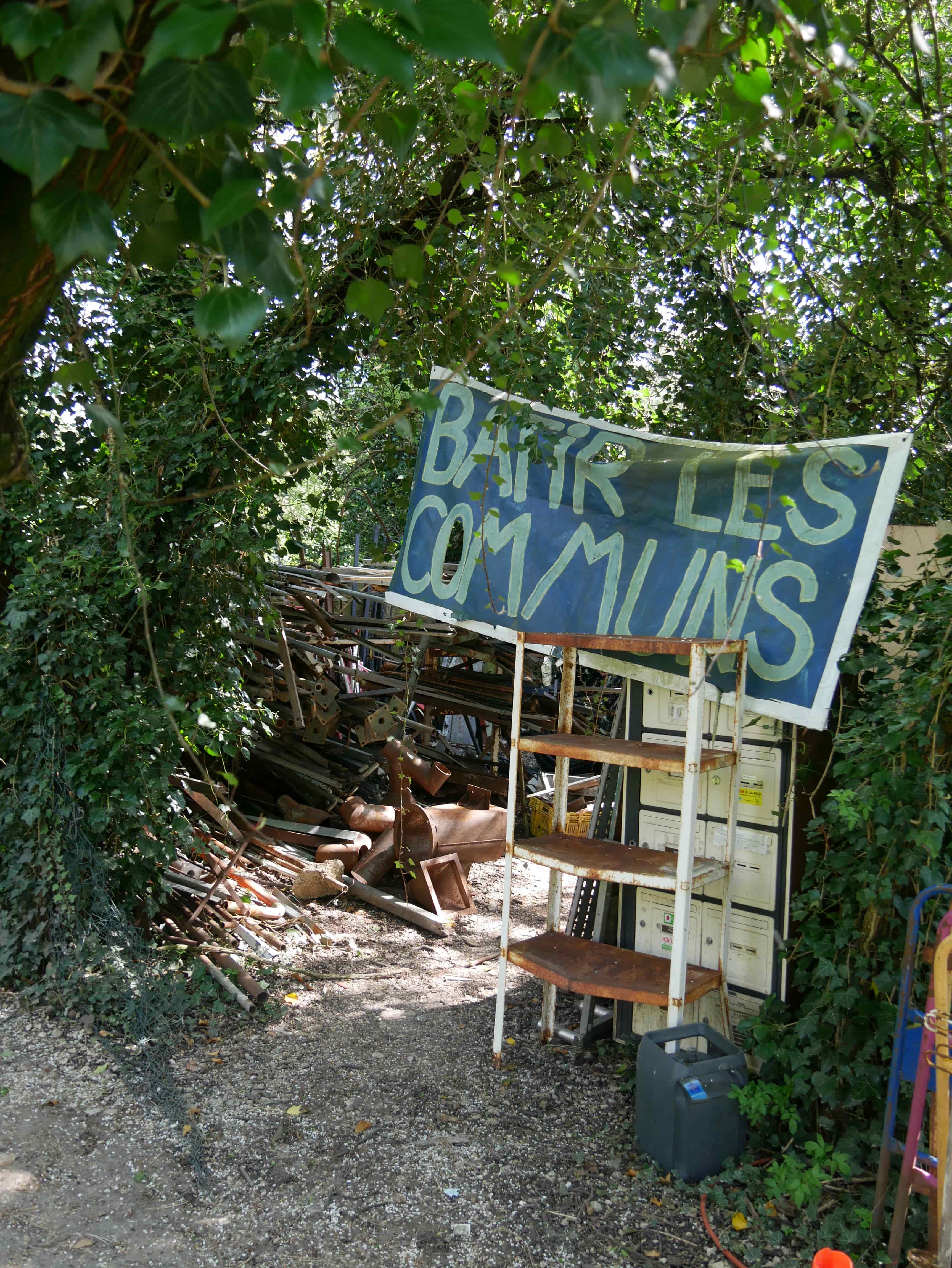 Cela nous amène à passer dans des lieux que j’ai peu fréquentés ces derniers jours, tels que la Maison Commune qui est en chantier en mixité choisie (sans hommes cisgenres), la Rebouterie où il y a du matériel médical et des plantes médicinales pour se soigner, le Snack Friche ou la Grange Rose où sont organisés des concerts, ateliers, réunions, le Free-shop pour se trouver des vêtements et d’autres choses gratuitement, la Toto-école pour apprendre la conduite de voiture, le grand BMX-park…