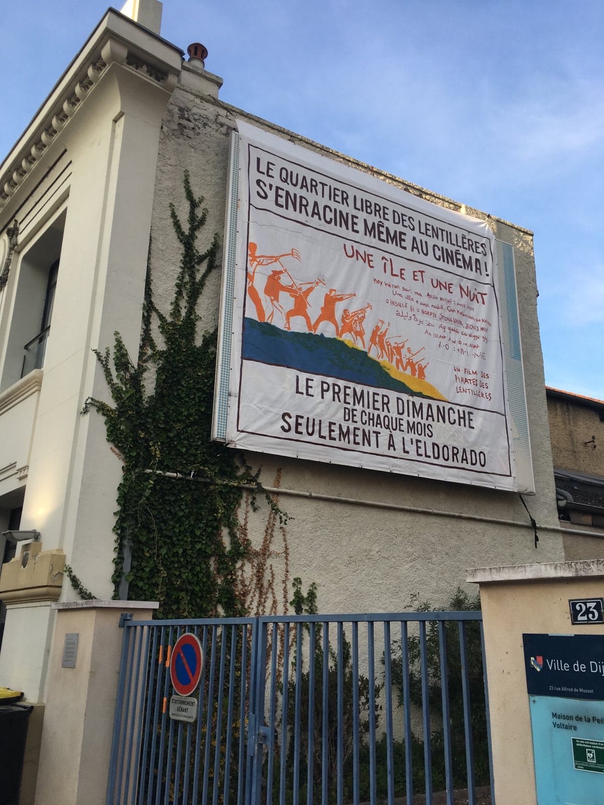 Dimanche en fin de matinée au ciné indépendant El Dorado, je vais allègrement voir « Une île et une nuit », le fameux film. Ce long-métrage a été écrit et tourné entre 2021 et 2023 au Quartier Libre des Lentillères sur la base d’ateliers de co-création avec les habitants et habitantes. Ce n’est pas un documentaire mais une fiction poétique, décousue et politique tournée à l’argentique qui joue sur des images fortes, qui montre la multiculturalité (11 langues sans sous-titres), les différents récits qui amènent à rejoindre le quartier, les différentes facettes de la lutte… Ces images me touchent beaucoup.