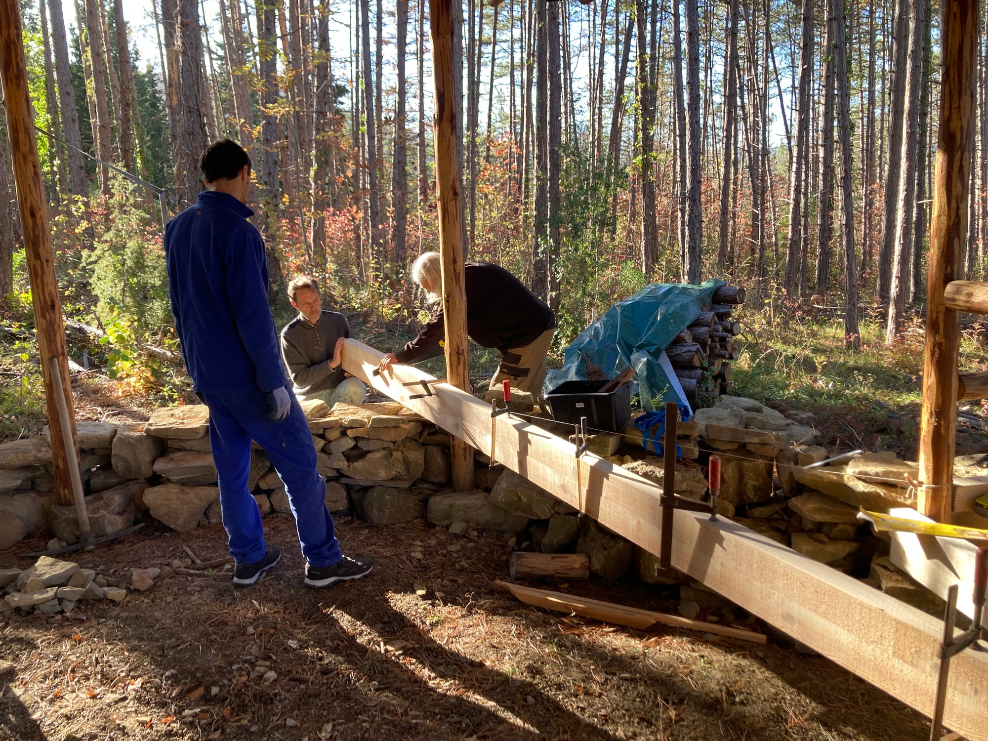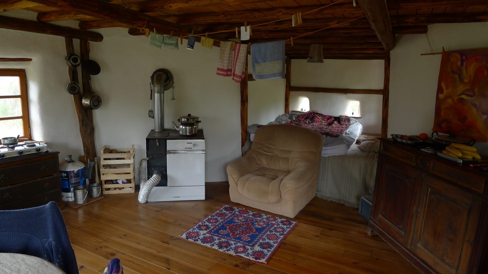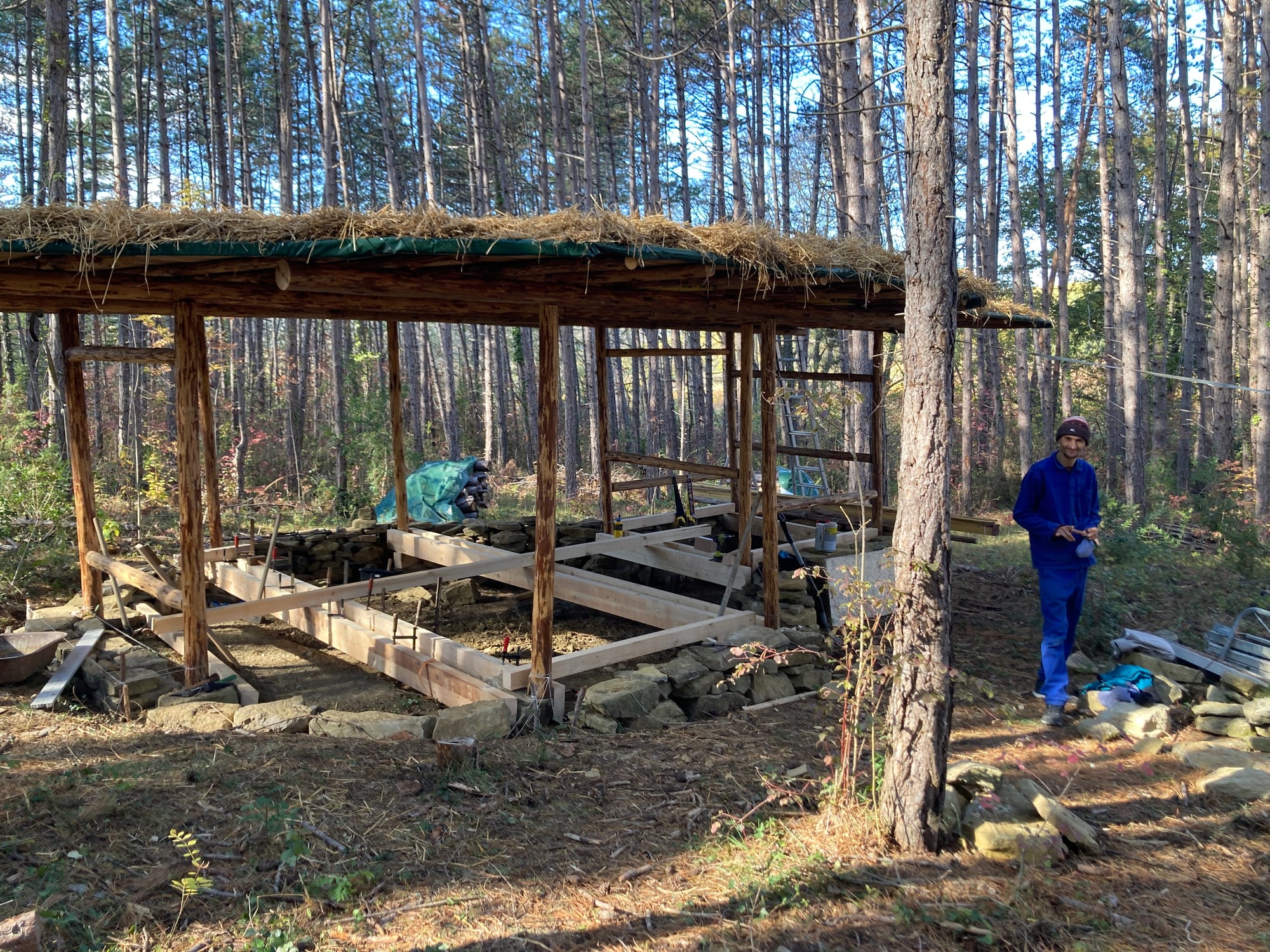 Les bois des pylônes porteurs viennent de la forêt que vous voyez en arrière plan et les pierres des fondations viennent d'un reste de maison en pierre qu'il y avait non loin. Bref, difficile de faire plus local comme matériaux pour une maison et c'est en plus une maison très résistante.