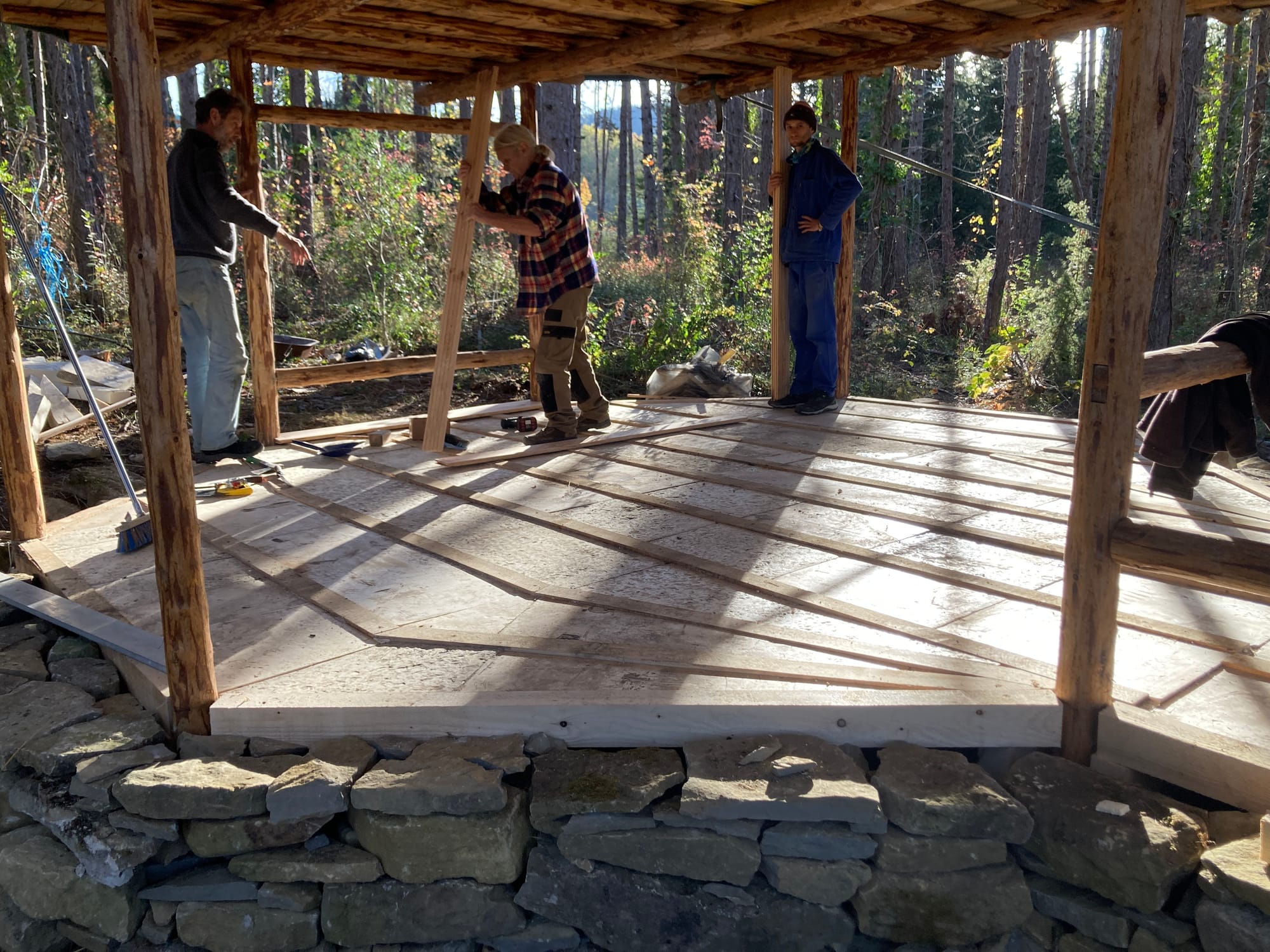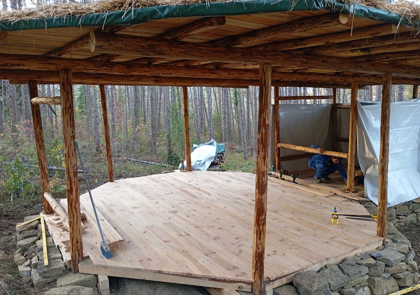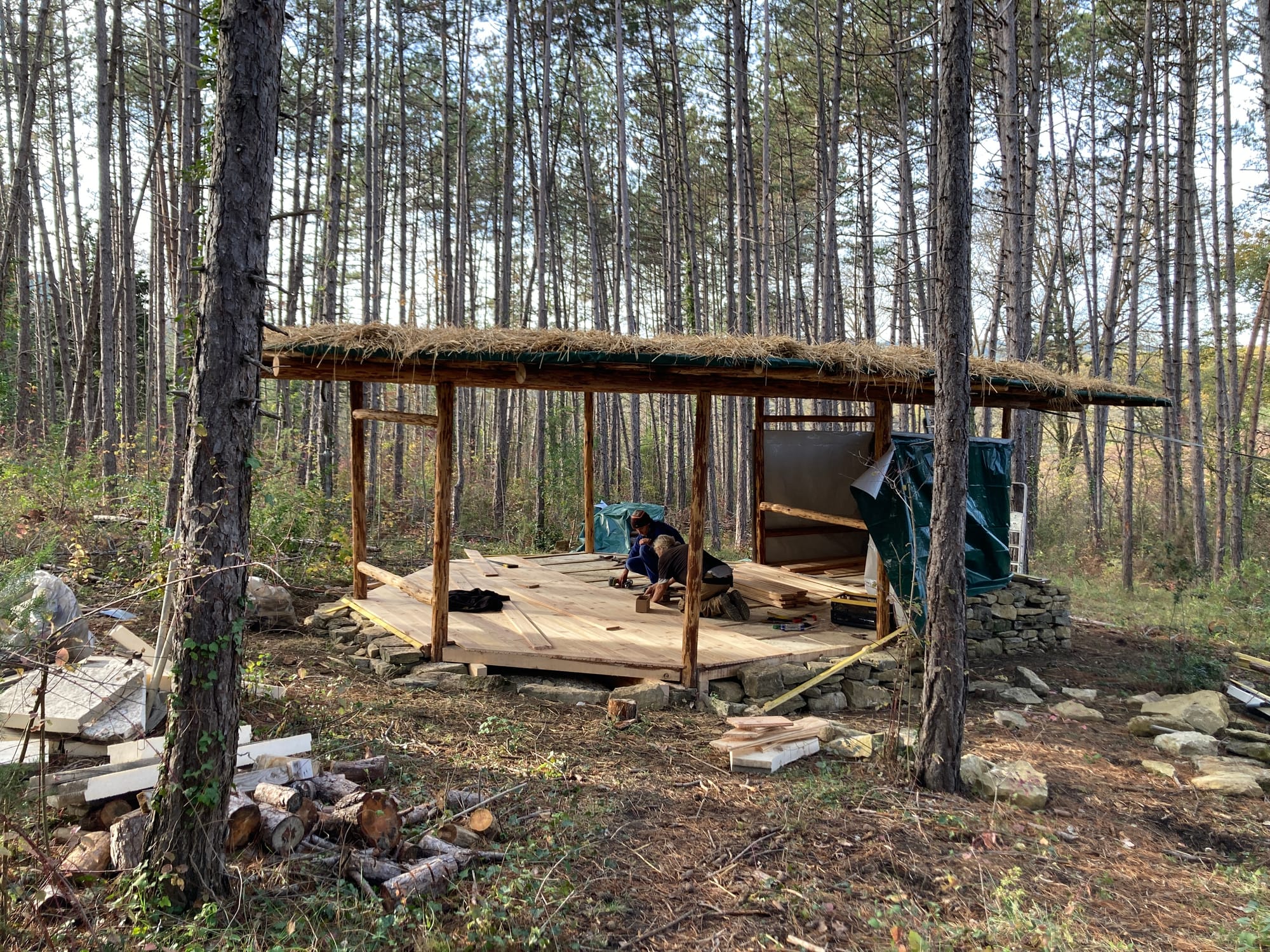 Les bois des pylônes porteurs viennent de la forêt que vous voyez en arrière plan et les pierres des fondations viennent d'un reste de maison en pierre qu'il y avait non loin. Bref, difficile de faire plus local comme matériaux pour une maison et c'est en plus une maison très résistante.