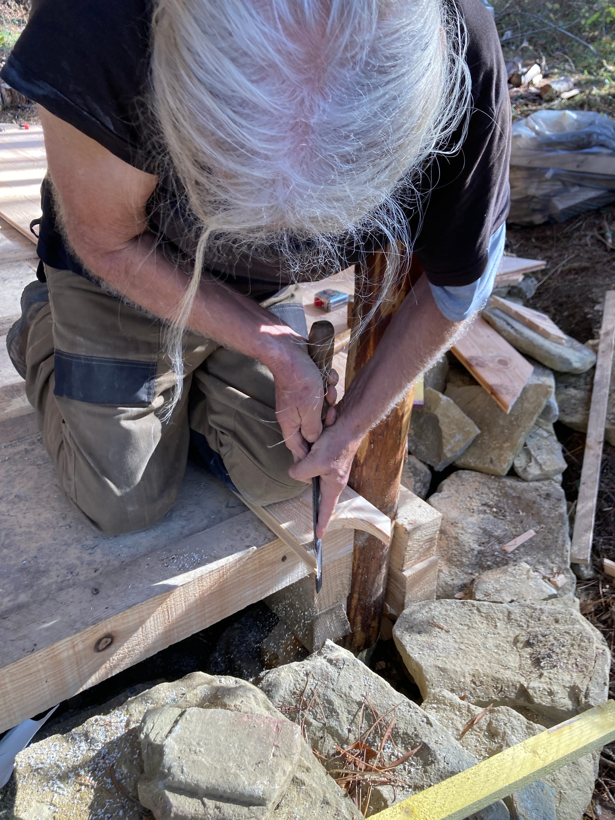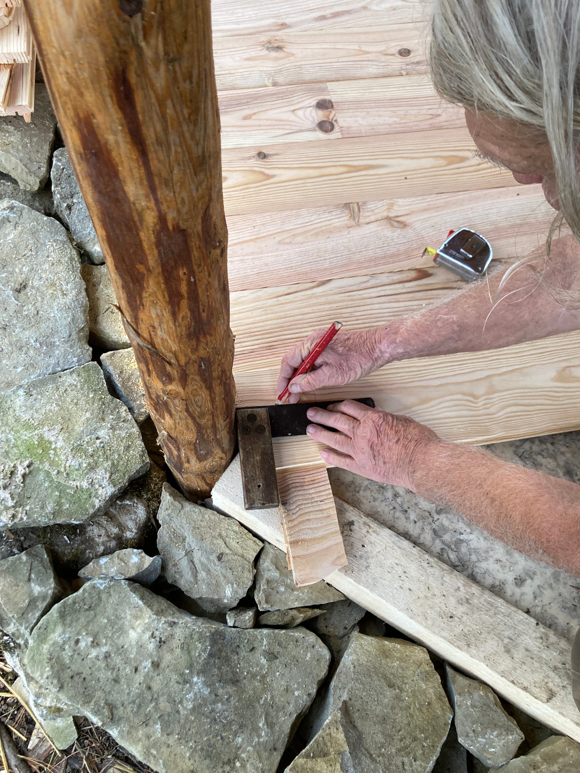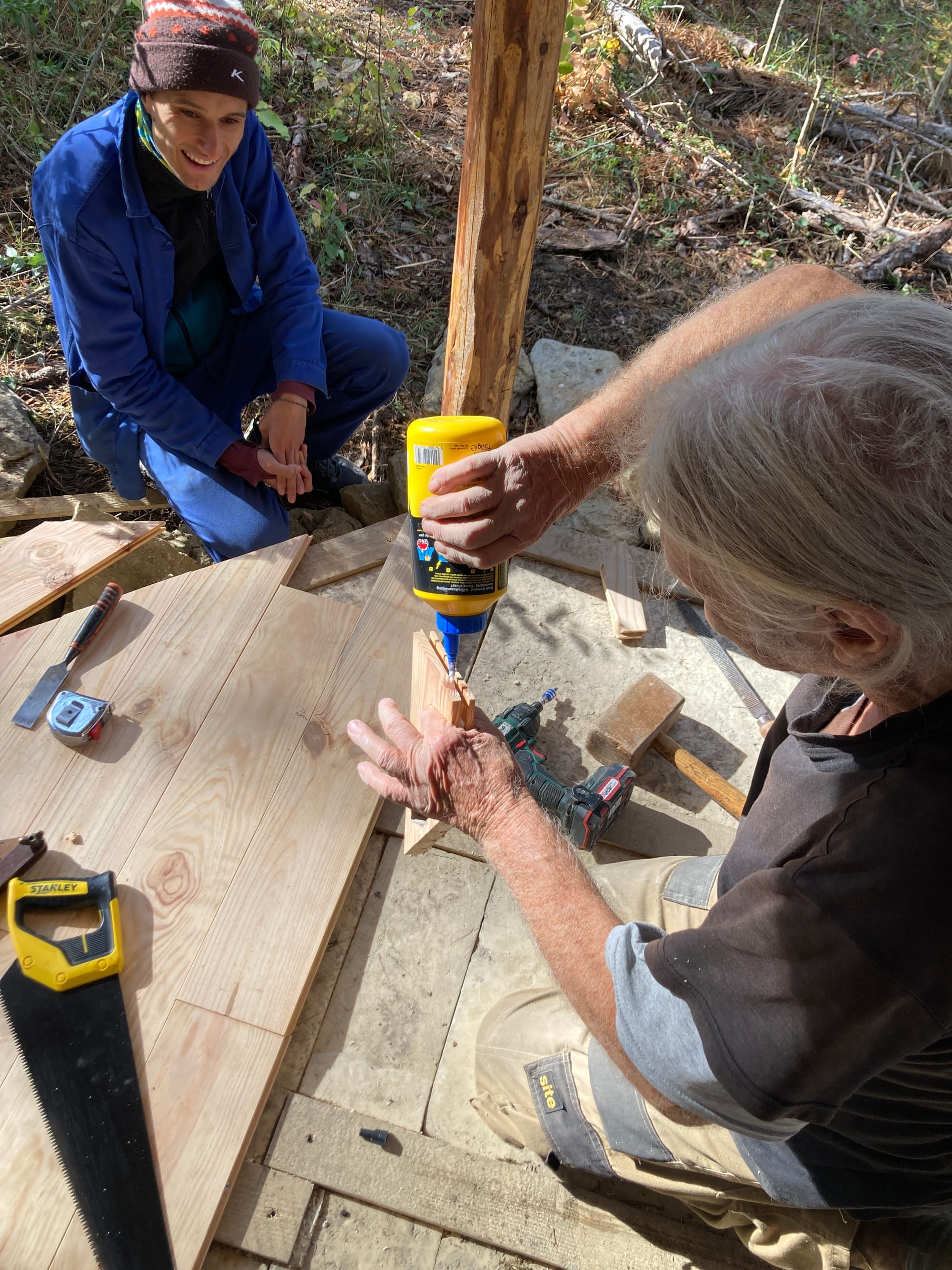 Travailler avec Walter sur la Maison Neuf Neuf, c'est surtout des bonnes blagues ! C'est aussi assister à des techniques manuelles enrichies de décennies d'expérience, c'est tester des choses, se remettre en question pendant le processus et chercher "la perfection dans l'imperfection". C'est-à-dire qu'en faisant avec ce qu'on a, que ce soit nos outils ou les matériaux utilisés, la maison n'est pas toute unie et de la même couleur, et c'est justement ses singularités qui en font tout son charme :)