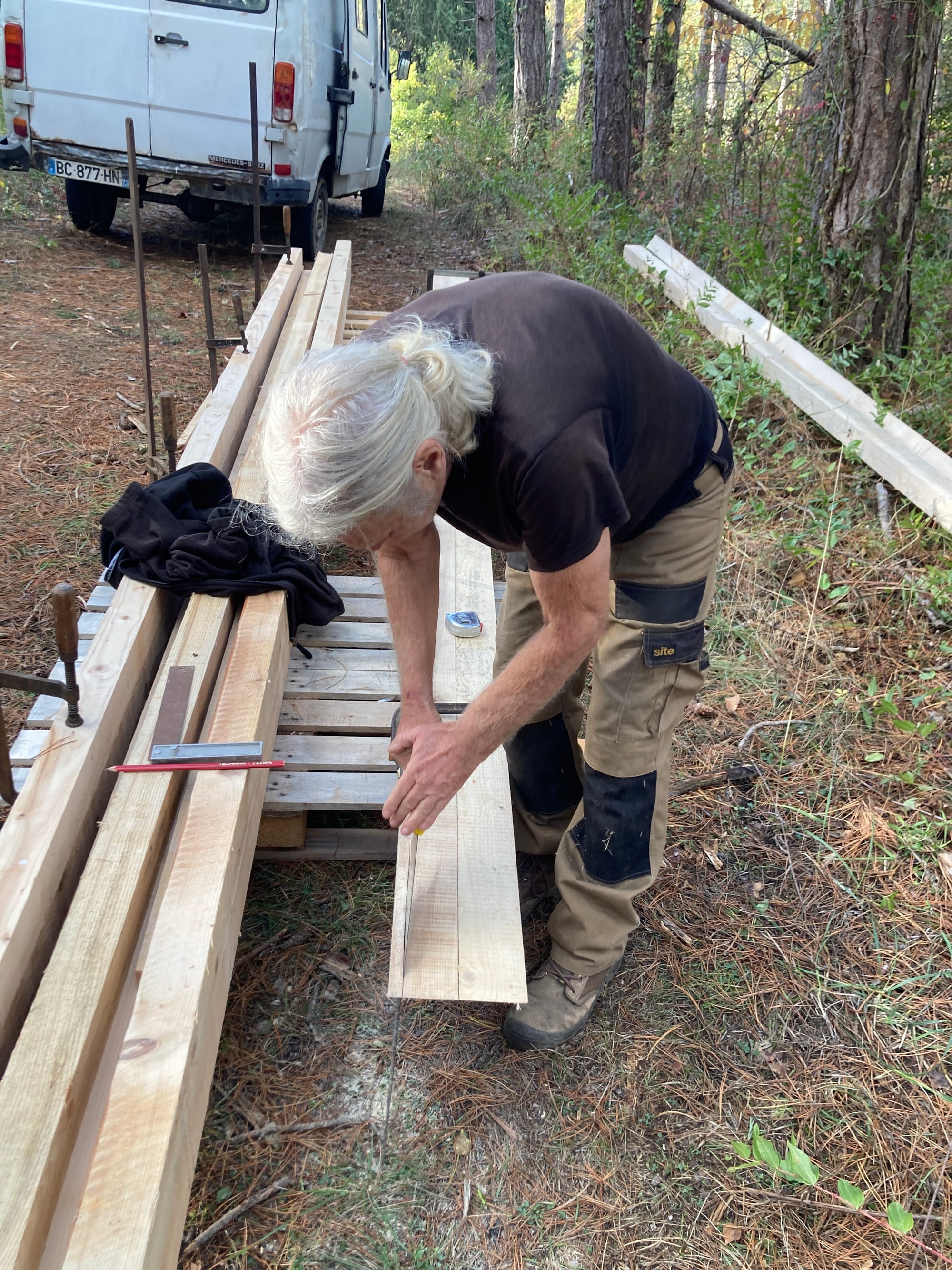 Dès notre premier jour, on commence par la construction d'une maison paille/bois chez Walter. Walter est la tête pensante (et les mains faisantes) derrière ce modèle de maison qu'il n'a cessé d'améliorer au cours de sa vie. En tout, il en a fabriqué quatre et nous arrivons pile au bon moment pour la construction de sa cinquième et dernière "Maison Neuf Neuf", à pas moins de 75 ans. Vous connaissez le dicton "si jeunesse savait et si vieillesse pouvait" ? Eh bien Walter il sait et il peut ! Il avait notamment à coeur de transmettre ses connaissances et son savoir faire et c'est tout naturellement qu'on l'a accompagné sur le chantier pendant une semaine et demi.