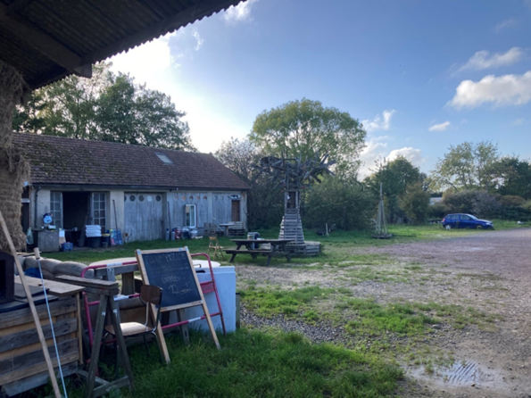 Quand je suis arrivée de nuit à La Demeurée, je me suis bien demandé ce que je faisais là. Passé le portail métallique grand ouvert, un grand hangar de foin occupe le fond de la cour. Devant lui, une table de pique-nique et un arbre fait de bois avec une guirlande à ses branches. Des deux côtés, des bâtiments et une maison. On devine un jardin derrière, l’air frais des arbres parvient à mes narines. Le gravier crisse sous mes pas et contraste avec le silence imposant du lieu. Ambiance.