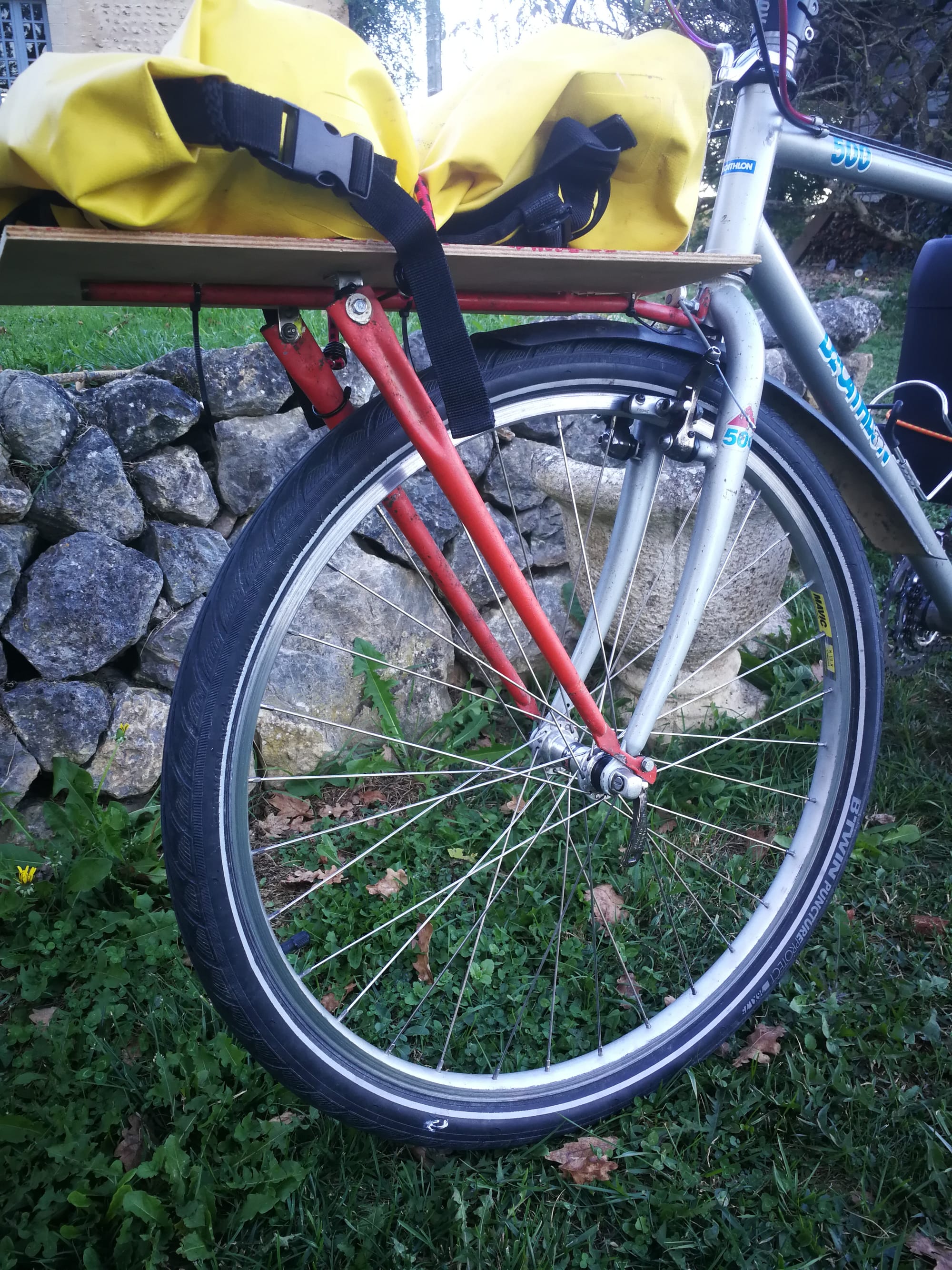 C'est à ce moment que nous avons découvert que les portes bagages avant étaient très chers et plutôt rares ! Le DIY a de nouveau été notre ami, en nous inspirant de ce très bon tutoriel youtube. Seule différence, nous avons utilisé un vieux cadre de vélo de course qui partait à la beine pour récupérer des tubes d'aciers comme matière première.