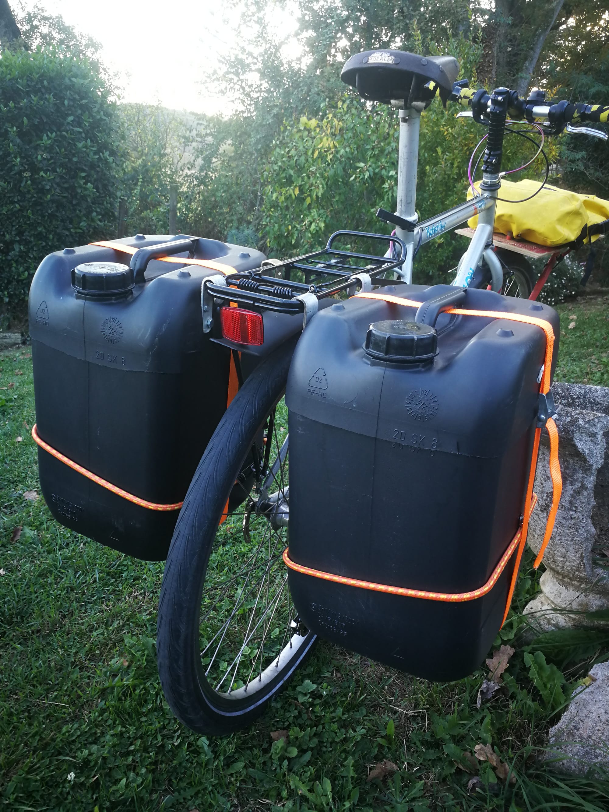 Le soucis avec un vélo qui est sensé porter tes affaires, c'est le prix des fameuses sacoches, que nous voulions résistantes à la pluie. Le DIY nous a sauvé, avec des sacoches faites à partir de bidons de récup en plastique d'une contenance de 20 L.