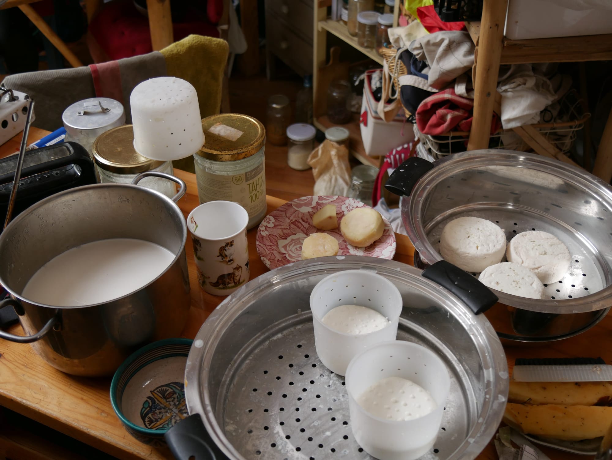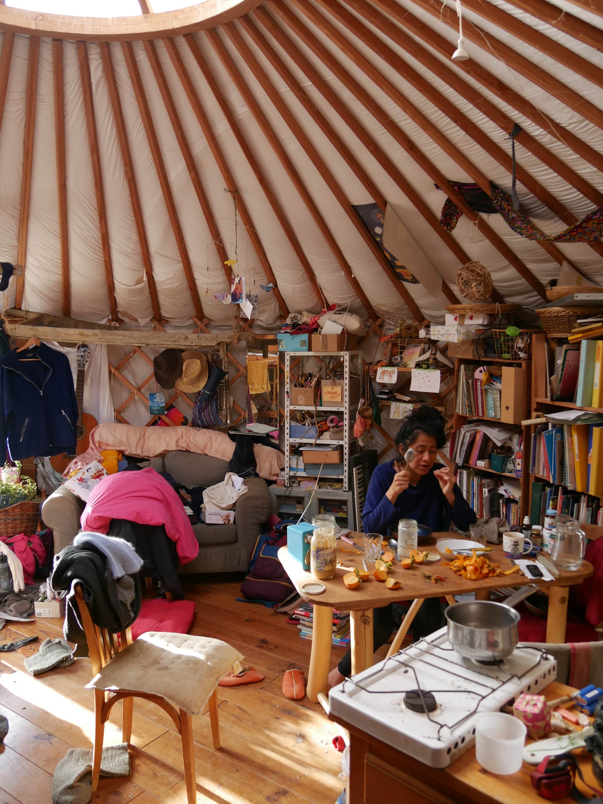 Sur le terrain boisé et vallonné acquis il y a 12 ans, une petite dizaine de yourtes installées autour des bâtiments collectifs accueillent une vingtaine de personnes, dont quasiment une moitié d’enfants. L’activité de maraîchage, les différents vergers, l’élevage de chèvres et d’abeilles ainsi que la production d’aliments transformés (tartinables, conserves, lacto-fermentation…) permettent aux membres du collectif de consommer une grande diversité de nourriture faite sur place. De plus, j’ai trouvé intéressants leurs questionnements par rapport à leur consommation avec la récupération d’objets et matériaux en déchetterie, l’utilisation de nombreux fours solaires paraboliques, le mode de vie en yourte, la construction terre-paille…
