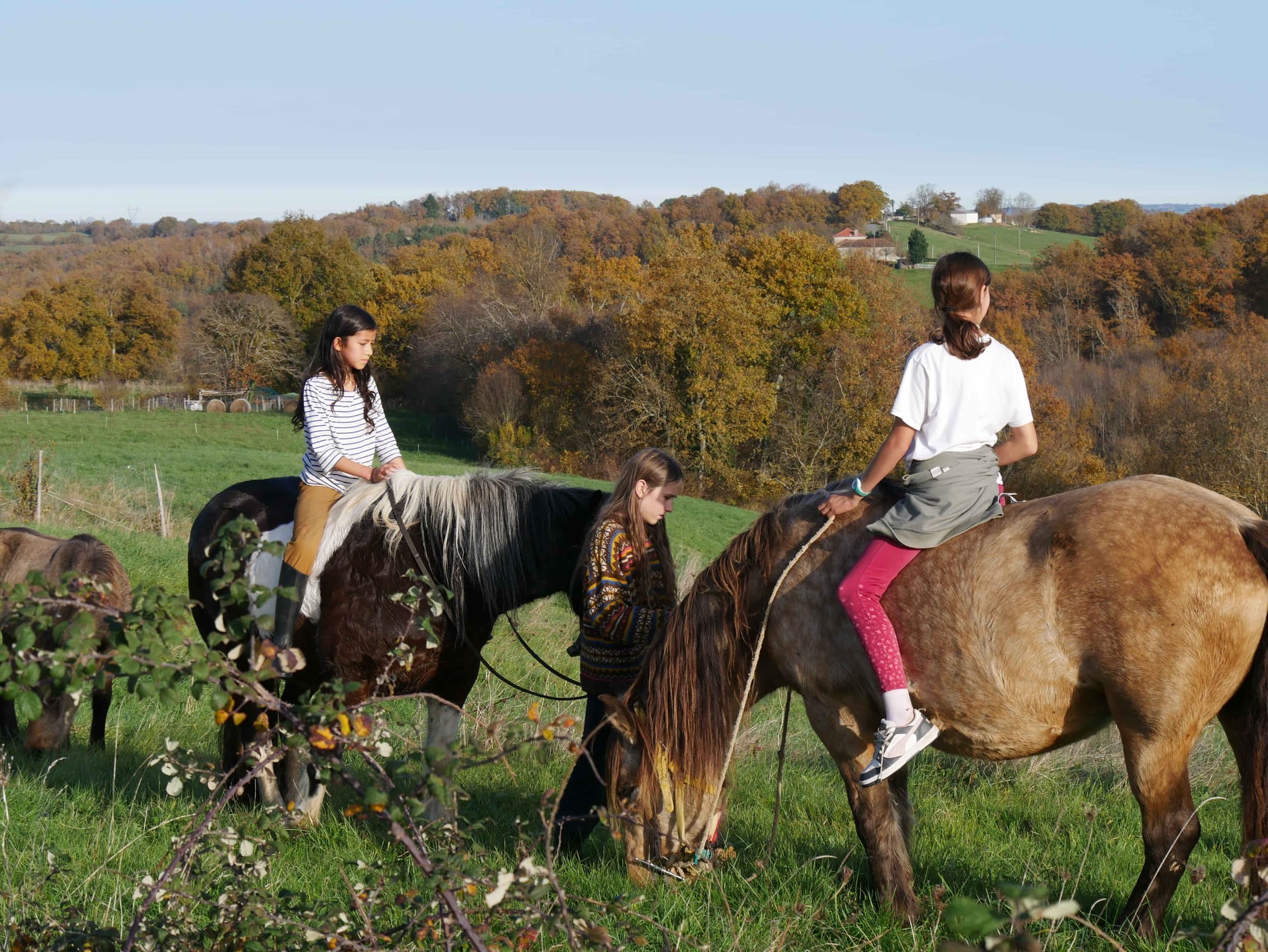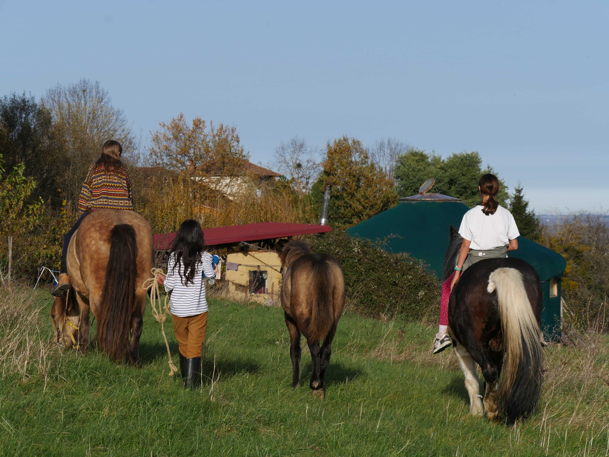 Je ne m’estime pas être une maman parfaite donc je tiens à lui offrir un cadre avec d’autres adultes et d’autres enfants qui puissent aussi l’accompagner pour qu’elle puisse avoir d’autres référents et expérimenter plein de choses que moi, toute seule, je ne pourrais pas lui apporter. C’est ce qui est génial ici. Pouvoir faire l’instruction en famille, en famille élargie, c’est beaucoup plus sympa que tout seul. Par exemple, j’adore voir depuis quelques jours Alou, Mainoa et Louvé prendre des initiatives tous les trois, cette petite bande avec ces grands chevaux. C’est génial.