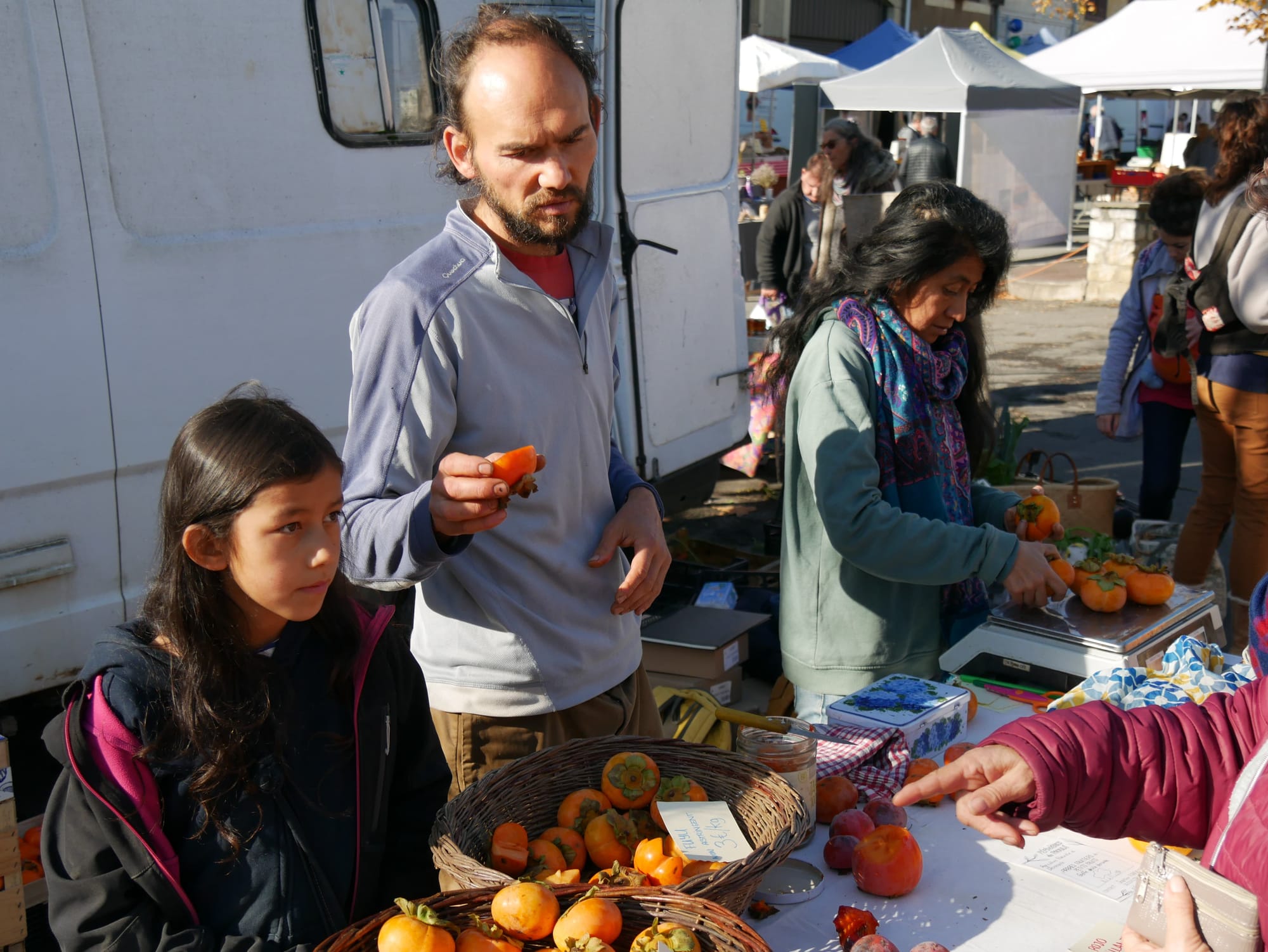 Assez tôt dans mon séjour, j’ai sympathisé avec Joachim et Nydia qui habitent le lieu depuis sa création. Leur yourte abrite aussi leur fille Alou, 11 ans, qui est littéralement née ici. Nydia fait de la construction terre-paille, s’intéresse aux plantes médicinales, accompagne des femmes enceintes avec le yoga. Joachim, lui, cultive de nombreuses variétés de kakis, s’occupe de ses deux chèvres, bricole toutes sortes d’objets avec du matériel de récupération. Et Alou, elle, monte à cheval, construit des jouets en bois, dessine des chevaux, fait de la couture. J’ai beaucoup été inspiré à leurs côtés et j’ai souhaité recueillir leurs mots pour rédiger l’article qui suit.